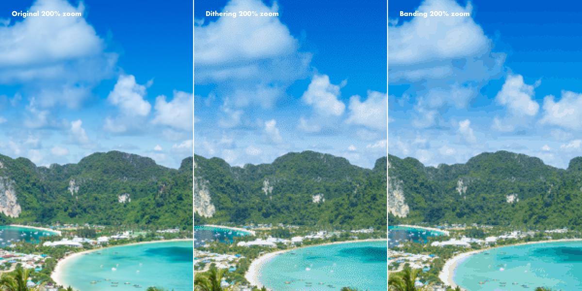 How to spot a badly compressed PNG? It’s a lossless compression so it works differently than JPEG. It’s simply missing colors. The errors will appear in the form of dithering, the little dots that try to make up for the not rendered colors. They do a pretty good job preventing banding from occurring, but still, this is not something that we want. It’s very easy to spot on photos, as these should be saved as JPG’s.