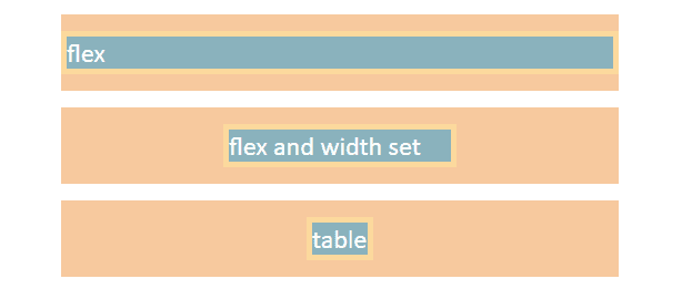 In the case of tables, they are kind of weird to me, but thankfully they are not commonly used. It is enough to set margin: 0 auto; without anything else to center a table element (the third example). Why is it so simple? Tables have box width equal to 100% (like blocks), but the content width is as small as possible (like inlines). Yes, if we set the width or min-width property to anything but 100% it will still be centered.